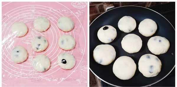 5、包好的小饼不要急着下锅,我们先用保鲜膜盖住,这样可以锁住水分,然后等待二十分钟左右,待小饼的体积膨胀起来。平底锅预热好,将小饼放进去,中小火来烙制,不要总是翻面,一面烙熟再翻面,这样烙出来的小饼更松软好吃。反之翻面太多,会使得面团不能很好地受热,口感发硬。