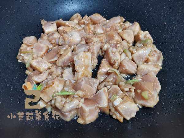 4、起锅烧油,最好用不粘锅来炒,不需要太多的油,炒起来也不会粘锅,鸡肉连带腌制的各种调味料一起倒入锅里,不用担心会黏连,晃动几下不粘锅,很快就散开,然后煎几秒掂几下锅,将鸡肉煎至成熟。