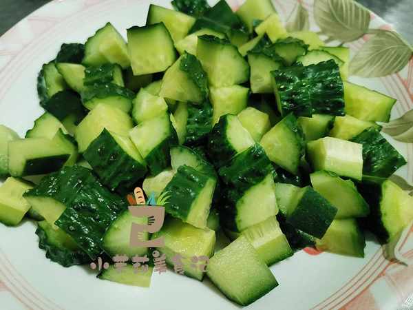 3、搭配一根清香脆爽的黄瓜,洗净之后,把黄瓜的尾巴切掉,然后分割成条,再进一步切成小丁。