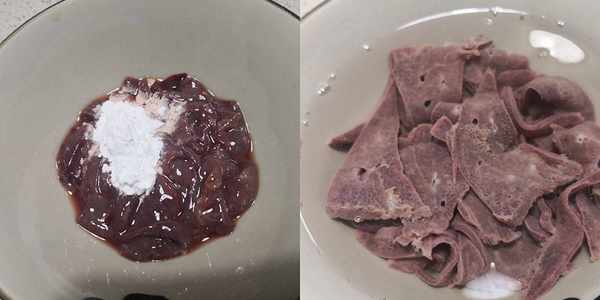 2、猪肝对于女人也是很好的一种食材,每周可以吃上一次。不过处理起来需要仔细些,切小块后,反复搓洗干净,调入白醋,淀粉抓一抓,然后再一次洗净。