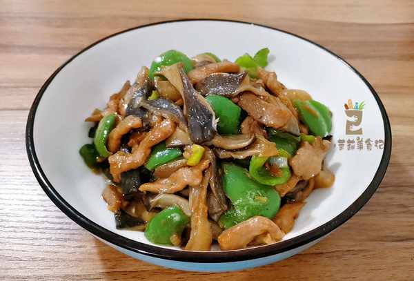 5、锅内的底油里边放葱花蒜蓉炝锅,先把柿子椒倒进去,要用大火来炒,这样柿子椒的香味会被激发出来,然后倒入平菇,调入一点生抽,醋,盐,大火快炒均匀,再次将肉丝倒进去,进一步炒匀,就可以出锅了。
