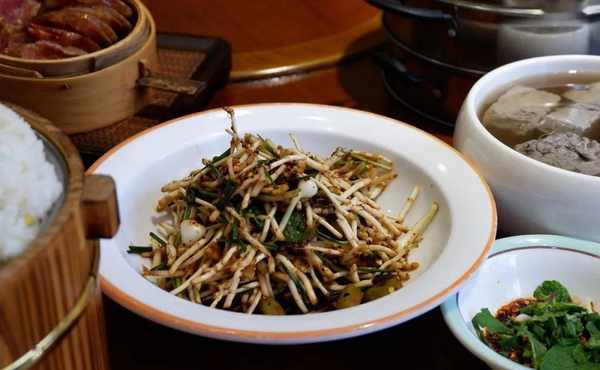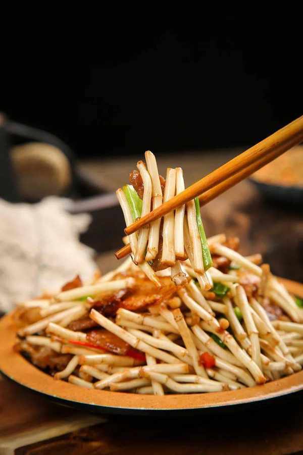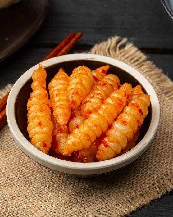 客人有点疑惑,像本地人那样夹起一根“虫子”放入嘴里,小心地嚼着,眉头就舒展了,天底下竟然有这样的滋味:嘎嘣脆、鲜嫩可口、清爽无比。吃着吃着,客人眼里心里只有这地蛹子,那么多主菜都给忘了。
