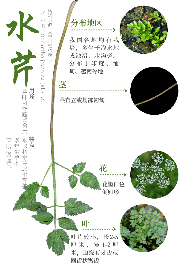 水芹菜也叫野芹菜,属伞形科,多年生草本植物,茎直立,叶片成三角形,茎叶都比家养的芹菜细小。水芹菜喜欢湿润肥沃的地方,一般长在河边或浅水沼泽处。