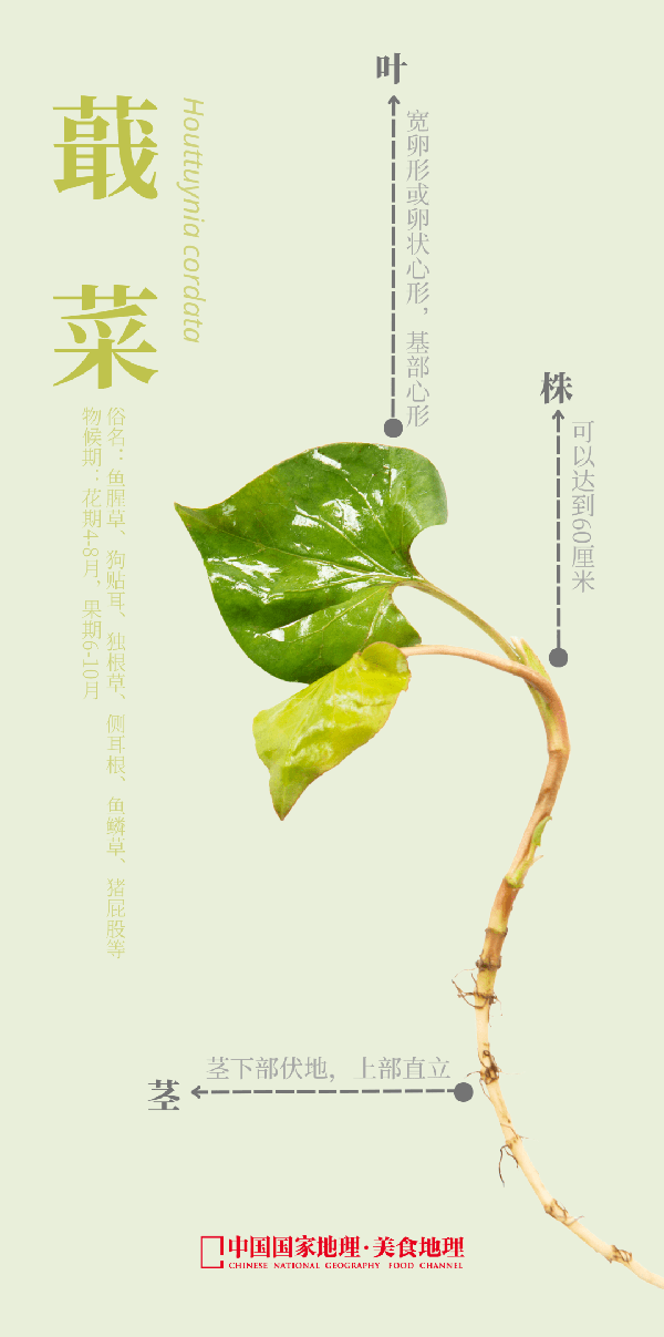 鱼腥草分泥土上和泥土下两部分,都可以吃,且吃法不一样。刚长出的叶片呈娇嫩的紫红色,渐渐长大转为绿色,有浓郁的腥味。