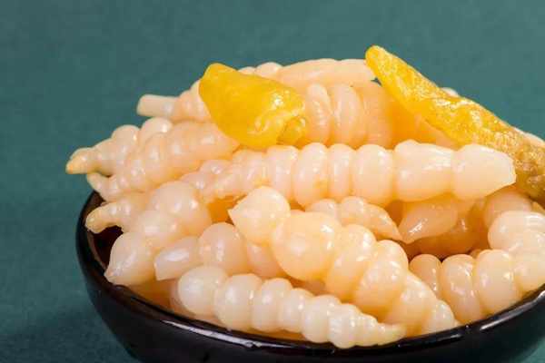 地蛹子可炒可蒸,也可做汤,做蜜饯或者酱菜。在都江堰,地蛹子大多时候被做了泡菜。无论是星级大酒店还是农村的坝坝宴,地蛹子总会比各种主菜先上桌。它们常卧在莴笋条、胡萝卜条中间,就像一群蚕宝宝躺在红红绿绿的窝巢里。