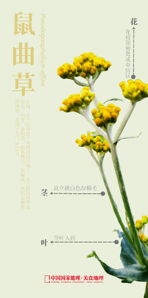 早在西汉时期,刘向编撰的《别录》里就有鼠曲草的记载,那时人们已经知道它有止咳的功效。明朝医药学家汪机在著作里提到过鼠曲草:“佛耳草,徽人谓之黄蒿。二三月苗长尺许,叶似马齿苋而细,有微白毛,花黄。土人采茎叶和米粉,捣作粑果食。”和都江堰人做春分馍馍的方法类似。