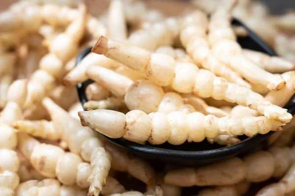 “地蛹子”颜色雪白,螺旋状,有点像参类,也有点像螺蛳,但更像虫子。 它的正式中文名叫做甘露子。