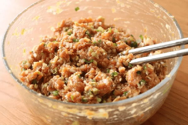 1、提前来准备300克左右的猪肉馅料,放入葱花姜末,生抽, 盐,然后用筷子充分搅匀。接着淋入一些烧热的玉米油进去,与肉馅拌匀待用。