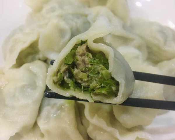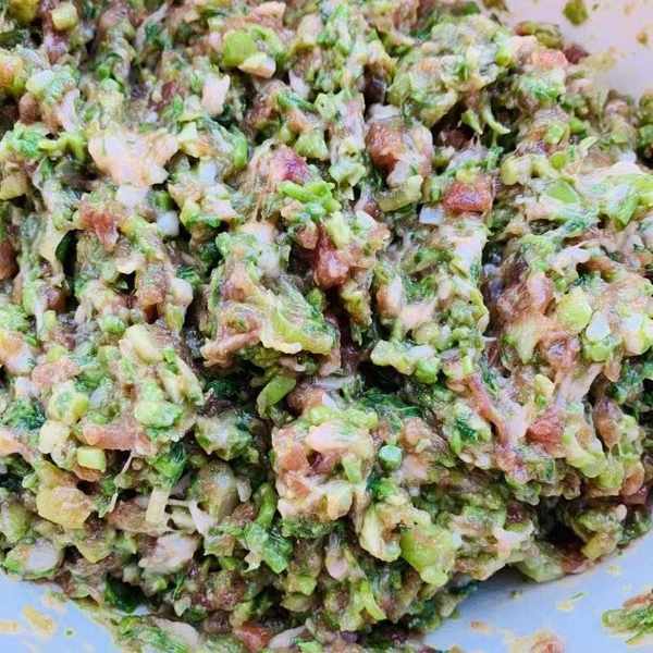 3、将焯好的刺嫩芽在冷水中降温,接着捞起来挤出水分,进一步剁碎,放到待用的肉馅中,继续搅拌均匀,就可以开始包饺子了。我们也可以准备一些虾仁,海鲜等,这样可以使饺子的味道更加鲜美。