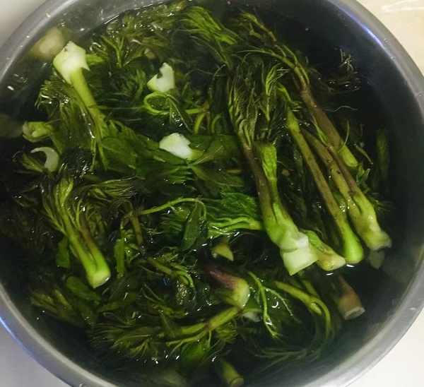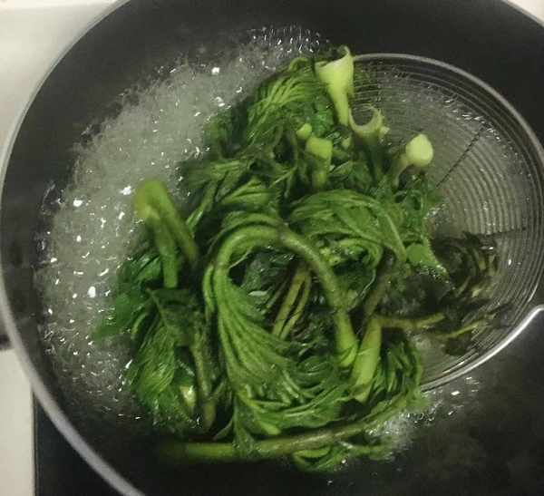 2、烧一些热水,撒入些许的盐,将刺嫩芽丢进去烫煮,其颜色会变得非常翠绿好看,令人食欲满满。这时候快速捞起控水。