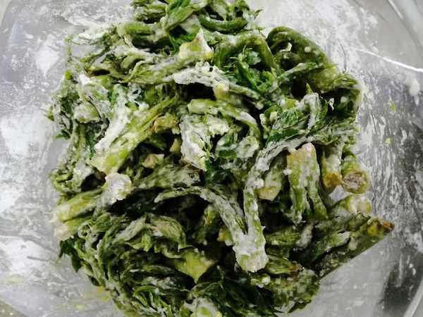 3、将控掉水分的刺嫩芽装入一个宽口的容器之中,先敲入一个鸡蛋,接着调入一点盐,五香粉,先把蛋液搅匀包裹住刺嫩芽,再调入一勺面粉与淀粉的混合物,然后进一步搅匀。