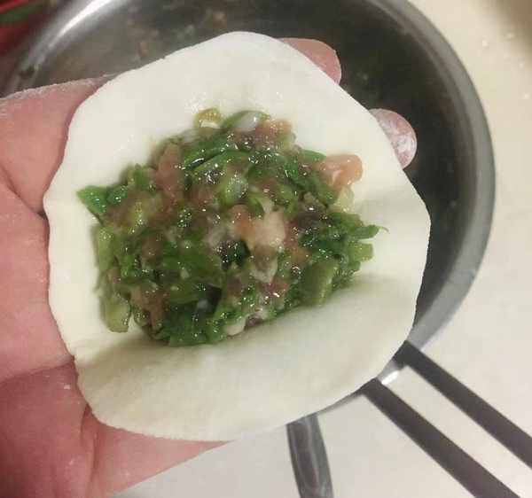 4、接着我们将准备好的饺子皮取出来,按照自己平日里的习惯,将馅料逐一包入饺子皮即可。