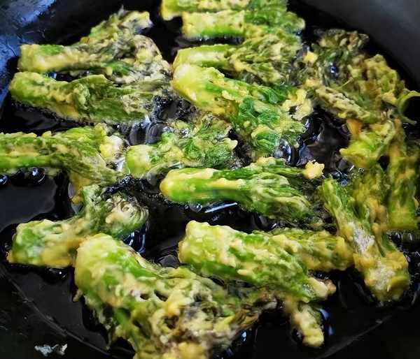 4、锅内倒入食用油烧热至五成左右,把刺嫩芽逐个下锅,保持中火来煎,看到底部泛黄的时候,及时翻面,直到全部煎至焦黄的状态,便可以夹出了。