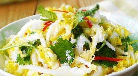 材料:白菜心1个,盐适量,油适量,胡椒粉1个,蒜头1瓣,醋适量,鸡精适量,香菜2条