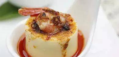 3、将腌制好的虾仁抹上油;日式豆腐中间挖一个洞,放入准备好的辣酱;然后把虾放在上面,然后淋上酱汁;放在盘子里,用柠檬叶装饰。
