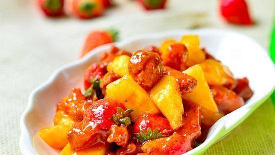材料:鸡胸肉160克,菠萝200克,草莓10个,炸鸡粉15克,黄酒1/2汤匙,番茄酱3汤匙,白醋1/2汤匙,生抽1/2汤匙白糖、水1汤匙、植物油500克、干淀粉1汤匙、面粉2汤匙。