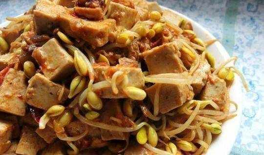 材料:豆腐一块;一碗豆芽;豆瓣酱一匙;一勺生抽(加味);一勺蚝油;葱花和蒜末适量