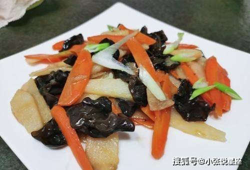 材料:山药200克、红萝卜30克、泡木耳20克、青椒20克、大葱、盐、鸡精