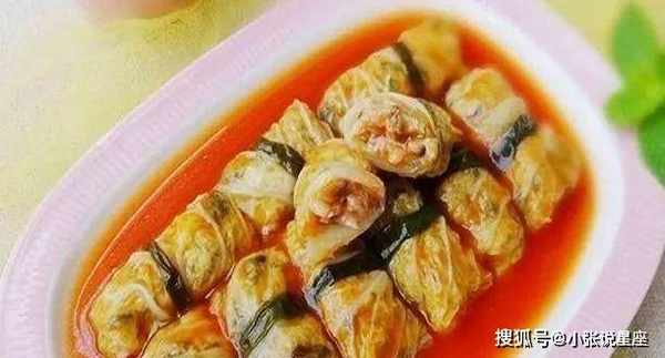 3、小白菜叶和韭菜叶洗净,放入开水锅中烫软,捞出用冷水浸泡,取小白菜叶一片,放上肉馅,包好,绑上韭菜叶,包好包好的蔬菜上蒸锅蒸15分钟4、蔬菜包子蒸好后,锅里倒入少许汤,加少许水烧开,加入适量的番茄酱,加入适量的盐和糖,搅拌均匀,最后倒入在水淀粉中加厚蔬菜卷。将汁倒入蒸好的菜袋中