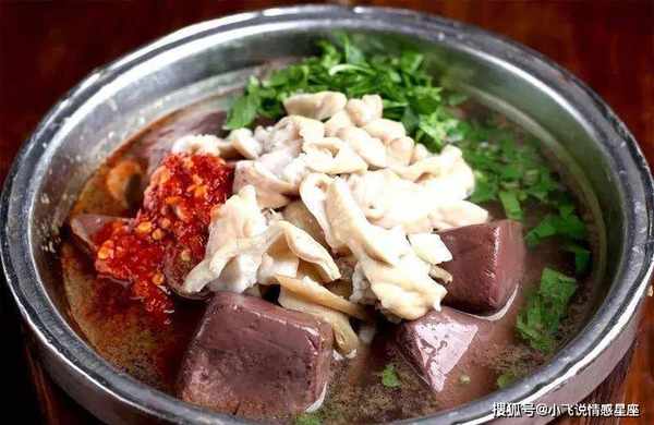 3.上桌时,先将煮好的猪血王莲汤舀入保温容器中,加入煮好的肥肠块、自制豆角、葱花、香菜粉即可食用。