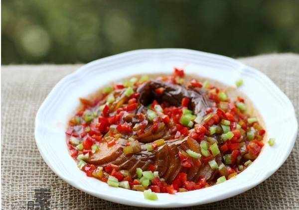2、将切好的茄子放入锅中蒸10分钟,捞出。青红椒去蒂去籽切碎备用。