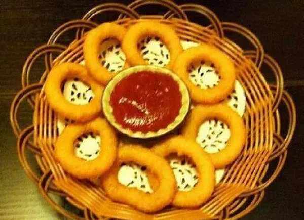 3.油锅烧热,放入洋葱圈,小火炸至黄色。