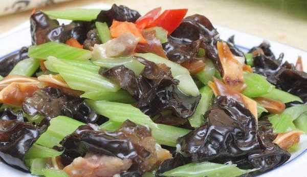 2.将清水倒入锅炉。水开后,加入一勺盐和少量食用油,倒入东北黑蘑菇和芹菜,焯水后过凉水。