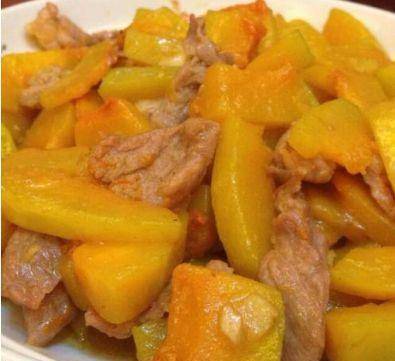1个南瓜,磨碎,切片或切丝,里脊肉切成薄片,洋葱和胡椒切碎,姜丝;