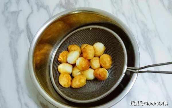 第二步:锅烧热,倒入少许油,油热后放入去壳的鹌鹑蛋,炸至表面金黄起皱,备用。