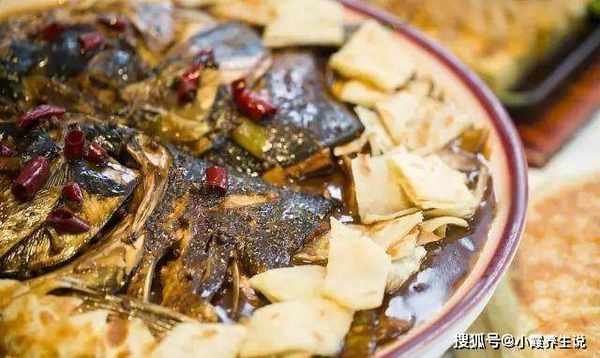 材料:500g鱼头/400g煎饼/300g白菜叶,油/盐/葱/姜/蒜/八角/10ml酱油,15ml香醋/10g糖/10ml料酒/50g香菜
