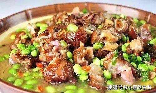 3、锅内油烧热,放入姜片、蒜片、青红椒片、干青花椒等炒香,加入鲜汤和熟好的猪蹄、青豆、盐、味精、料酒、鸡粉将猪蹄煮至入味,装盘。