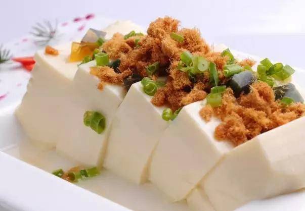 原料:豆腐160克,肉丝、洋葱、黄瓜,用少许油、盐、味精、香油炒熟。