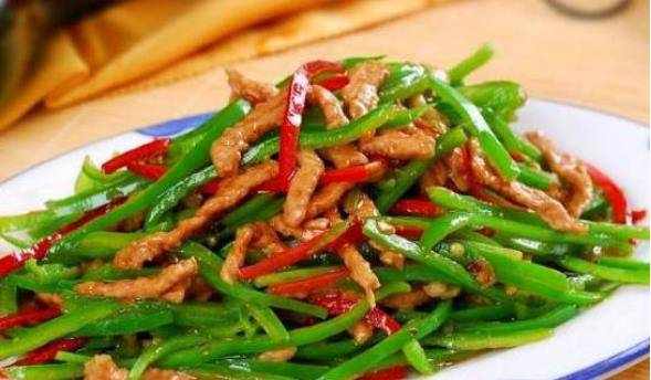 原料:青椒、猪肉、红椒、姜、淀粉、盐、鸡汤、酱油、豆角。