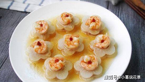 原料:白萝卜1个,虾仁10只,肉末100克,油1茶匙,浆果10个,胡椒粉少许,酱油1茶匙,椰子1茶匙,生姜1片,盐少许。