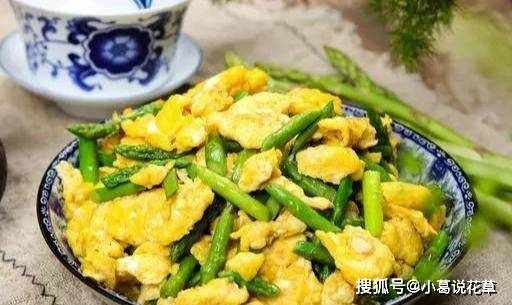 4、另起一锅,倒入适量的油,将蒜头炒出香味,放入芦笋用热火快速煎1分钟,然后倒入鸡蛋液,同煎。出锅前加盐调味。