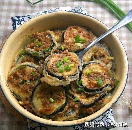 10.将炸好的茄子片放入混合肉馅中,加少许香葱拌匀