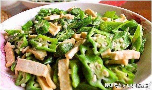 1.豆腐干切小块;大蒜去皮切片;秋葵去蒂,洗净斜切;