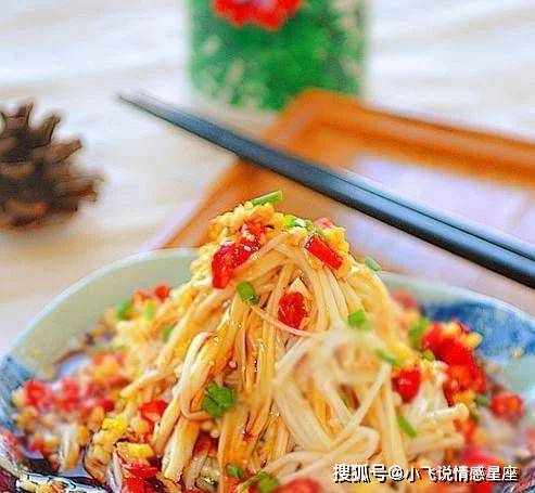2.锅里放油,加入葱、姜、蒜和辣椒炒香,然后加入盐,搅拌均匀,淋在金针菇上。3.将酱汁与蚝油、酱油、醋、辣椒油和麻油混合,均匀淋在金针菇上,最后撒上切碎的香葱即可。