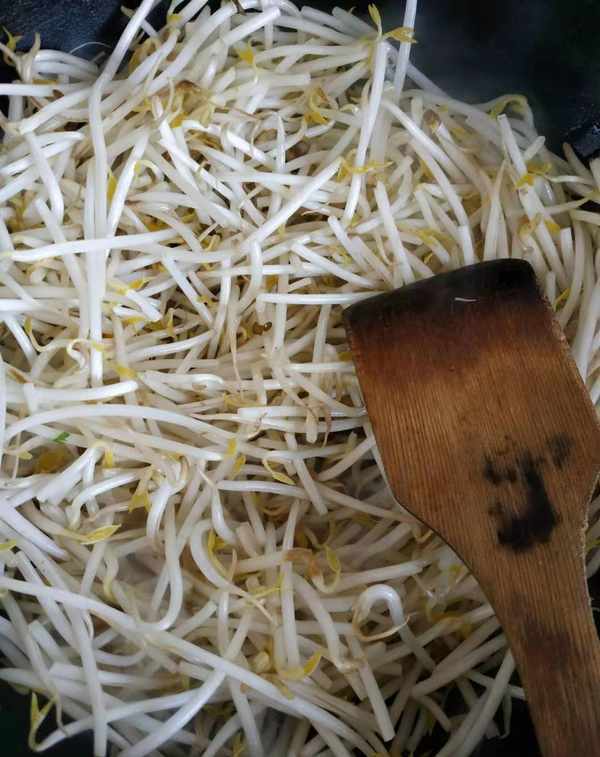 3、锅留底油,放入豆芽炒至断条,加入生抽、五香粉,炒匀;