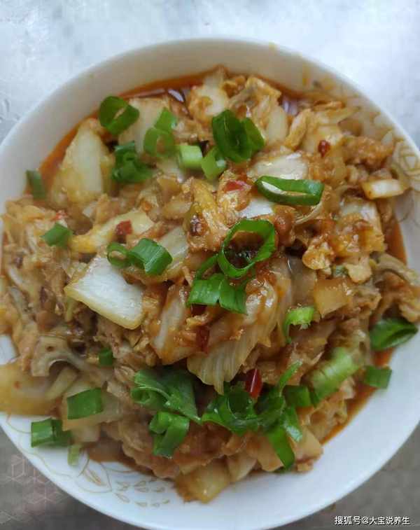 5、出锅前加入几滴醋,装盘,撒上洋葱,一盘美味的炖白菜就做好了。