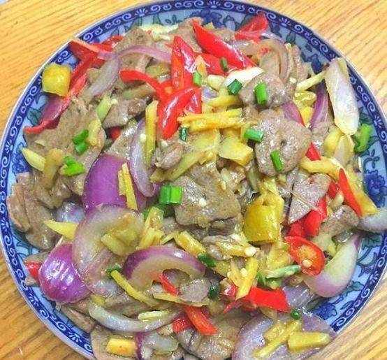 4、锅里的油加热到30%的热度时,将猪肝放入,捞出。