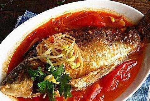 材料:鲫鱼1条、黄豆芽30克、西红柿3个、香菜5克、生姜5克、葱5克、大蒜10克、韩国辣椒酱半碗、白糖1勺、1鸡精1勺,盐1勺,香料1勺,酒2勺