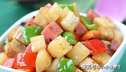 1)青红椒去蒂去籽,洗净切丁。火腿丁。干豆腐切块。莲藕去皮、洗净、切丁