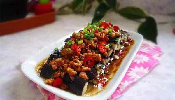 材料:茄子、肉碎、大蒜、香葱、老抽、盐、料酒、糖、淀粉。