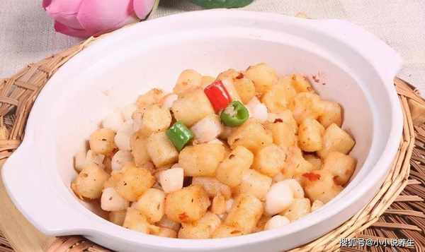 1.山药用铁棒切丁,撒少许干淀粉拌匀,加入60%的热油拉油至表面微黄,另起一锅加水,将解冻的扇贝放入沸水中一会儿。并迅速删除它们。