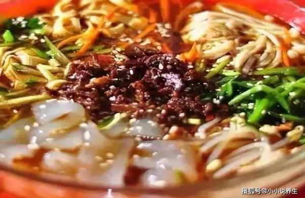 4、将冷面盛在桌上的碗中,撒上黄瓜末或萝卜末、芹菜末等,盖上醋、蒜末,再盖上准备好的麻酱,用筷子拌匀即可食用。