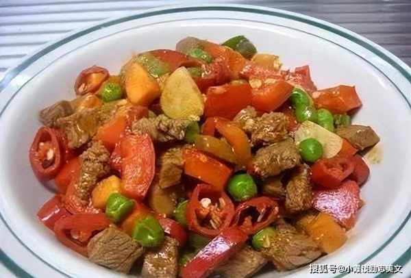 材料:牛里脊200克、豌豆200克、红椒半个、黄椒半个、姜2片、干辣椒数个、香蒜辣椒酱2汤匙、料酒1茶匙、生抽1茶匙、干淀粉1茶匙、蚝油2汤匙、盐1/2茶匙