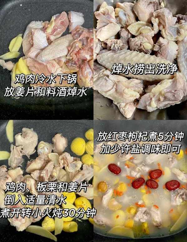 【材料】:鸡,板栗,枸杞,红枣,生姜,葱。