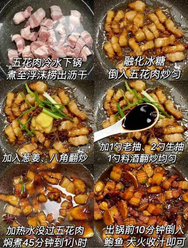 【材料】:五花肉,鲍鱼,生姜,葱,八角,冰糖,生抽,老抽,料酒