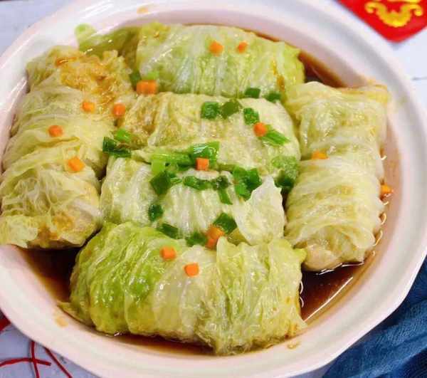 一,【白菜肉卷】白菜谐音“百财”,“摆财”,中国人过年图吉利,饭桌上用白菜卷肉,做成【白菜肉卷】,不但寓意好,而且味道鲜美,中间加入马蹄,口感鲜甜,营养清淡又好吃!